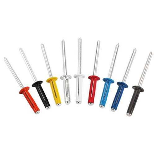 | Ok, they don’t really explode, but the back side splits into folds so you don’t normally need to use a back-up washer with them. They work great where it’s hard to reach the back side | Available colors: Plain, Black, White, Red, Orange, Yellow, Pepsi (light) Blue or Chevron (dark) Blue | Box of 250 | Small head is 3/8 O.D. | Aluminum pop rivet with aluminum shank | Reach 0" - 0.375" |