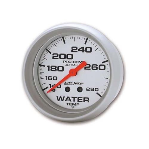 | Mechanical Water Temperature Gauge | 140-280 °F gauge measurement range | Lighted | Silver Gauge Face | Black Lettering | Fluorescent Red Needle | Brushed Aluminum Bezel | White Incandescent Light | Included Adapter/Fitting: 1/2"" NPT adapter/fitting | Includes Light Covers | Includes Mounting Bracket(s) | 6 ft. Capillary Tube Included |