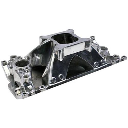 These manifolds have permanent mold castings for accurate port placement, tighter grain castings, and less porosity.  They have nitrous bosses, measure 5.12" from carb base to bottom of manifold, and are available in satin finish or polished (the area under the intake runners is not polished).  Available plain or polished.